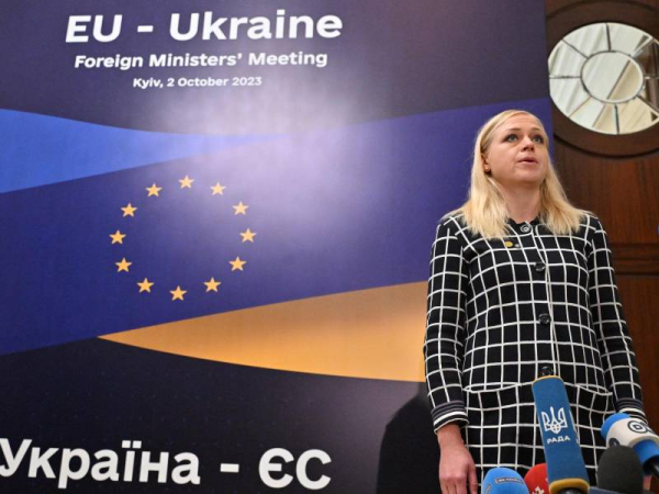 Minister for Foreign Affairs Elina Valtonen (NCP) gave a statement to media before she and her EU colleagues held a historic meeting in Kyiv, Ukraine, on Monday, 2 October 2023. Valtonen stated after the meeting that it is the duty of policy makers to communicate that Finland is unwavering in its support to Ukraine. (Sergei Supinsky – AFP / Lehtikuva)