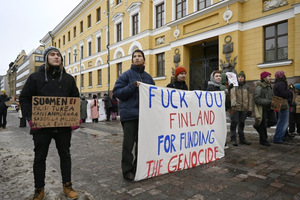 A protest against Finland and Israel’s arms trade in front of the Ministry of Defence in Helsinki on January 10, 2024. According to the demonstrators’ statement, the protest aims to remind the Minister of Defence and the Ministry of Defence of the everyday reality of Palestinians and that Finland’s arms trade supports the Israeli army and the bombing of civilians in Gaza. The protesters demand Finland to cancel the purchase of the David’s Sling missile system and to end all arms trade with Israel. /Lehtikuva