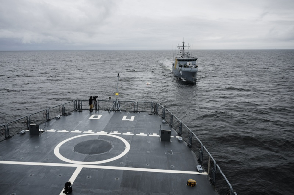 The naval mine countermeasures vessel MHC Vahterpää (R) seen from German navy replenishment ship FGS Mosel during media event of the navy s spring main exercise Narrow Waters 25, led by Finnish navy, on the sea outside Helsinki, Finland on May 23, 2025. Photo: Roni Rekomaa / Lehtikuva