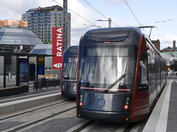 Trams at Sori Square in Tampere in September 2021. Tampere has retained its status as the most appealing city in Finland, ranking among the top three in a total of eight regions, shows a survey by Taloustutkimus. (Jussi Nukari – Lehtikuva)